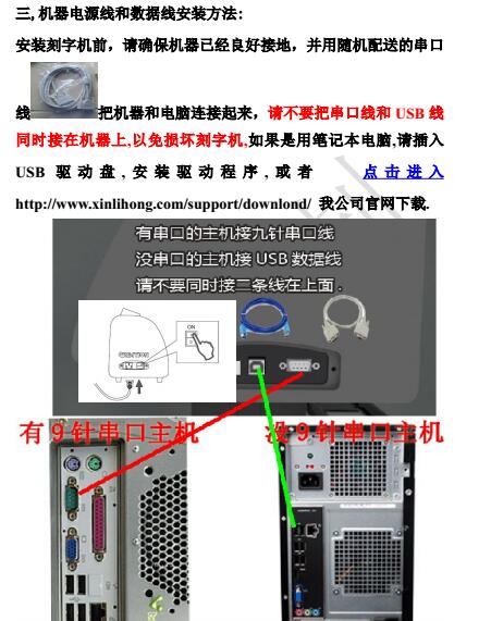 安裝刻字機前,請確保機器已經良好接地,并用隨機配送的串口線把機器和電腦連接起來,請不要把串口線和USB線同時接在機器上,以免損壞刻字機,如果是用筆記本電腦,請插入USB驅動盤,安裝驅動程序,或者 點擊進入 http://www.kxuh.cn/support/downlond/ 我公司官網下載.